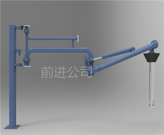 密閉(bì)式頂部裝卸臂由5個旋轉接組成回轉**,液相4個,氣相1個。氣相一般爲DN50,液相根據客戶需要的流量選擇。氣相在轉接處使用金屬軟管連接,保證鶴管的旋轉靈活性。鶴管液相接口朝下,氣相接口朝上,一般氣相會多台彙總在一個主管上,如果單台排空的話,需要加帶雨帽的阻火器,**管道進入點燃源。垂管上有一個錐形密封帽,裝車時垂管插到槽車的頂部灌口,密封帽壓實在灌口處,鎖緊外臂鎖緊杆(或者氣缸壓緊,在和油氣回收配合使用時,建議鶴管增加氣缸,達到充分密閉(bì)的作用,因爲空的槽車在裝車時物料逐漸增多,槽車輪胎壓扁,槽車降低,密封帽就不能很好的密封瞭(le),必須有氣缸對密封帽有一個壓力,才能使密封帽始終跟緊灌口。達到有效密閉(bì)的效果,油氣回收需要密閉(bì)效果達到90%-95%)密封帽密閉(bì)後,槽車裏氣化的介質就能通過鶴管上的氣相管道排空或者抽入油氣回收系統